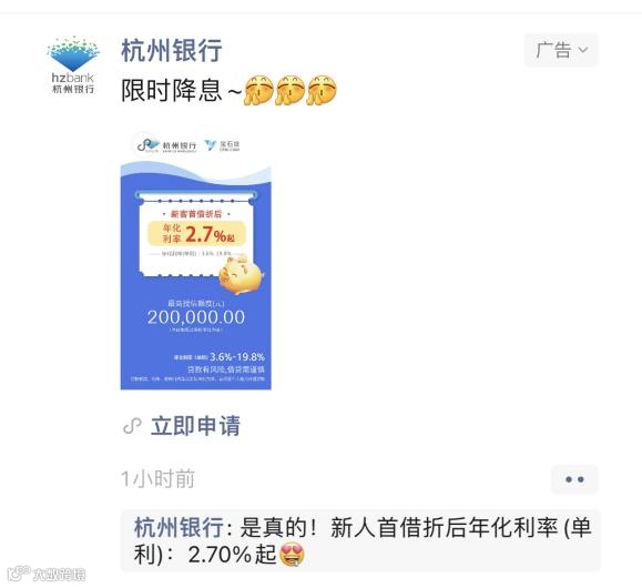 例如,近日记者常在微信朋友圈刷到杭州银行消费贷的营销广告。该行针对新客户推出了额度最高20万元的宝石贷。从2.88%到2.70%,该消费贷产品利率在9月里便几番下调。此外,贷款申请成功后,客户有机会获得50元-100元话费券。