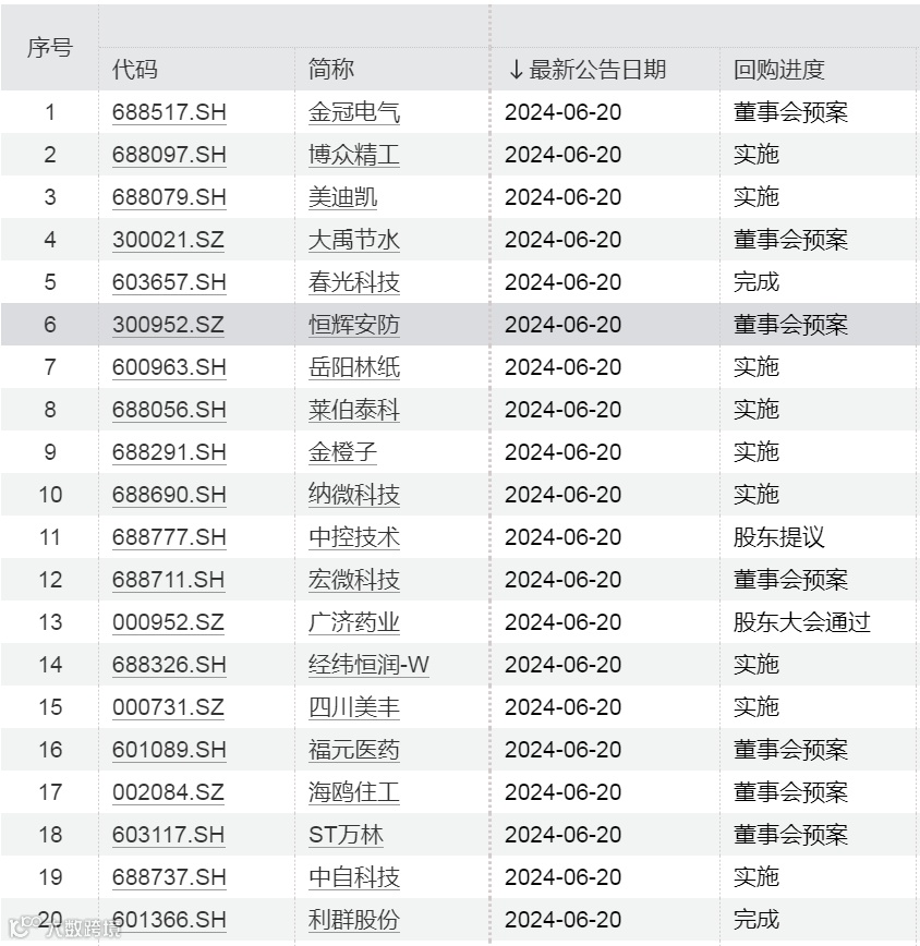 本周以来,又有多家上市公司发布回购相关的公告。Wind数据显示,本周以来,截至6月19日20:30,已有110家上市公司发布回购相关公告。6月19日晚间,截至20:30,金冠电气、博众精工、美迪凯、大禹节水、春光科技等31家上市公司发布回购相关公告。