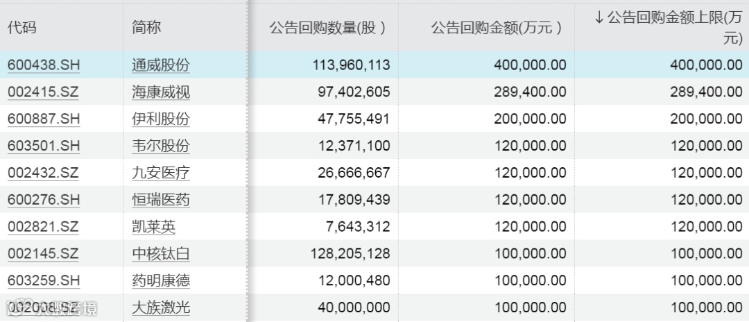 从今年以来发布预案的上市公司公告回购金额上限情况来看,通威股份回购金额上限为40亿元,海康威视回购金额上限为28.94亿元,伊利股份回购金额上限为20亿元,韦尔股份、九安医疗、恒瑞医药、凯莱英的回购金额上限均为12亿元,中核钛白、大族激光、泰格医药等多只股票回购金额上限均为10亿元。值得注意的是,药明康德、顺丰控股今年均曾两次发布回购金额上限在10亿元的回购预案,合计均为20亿元。