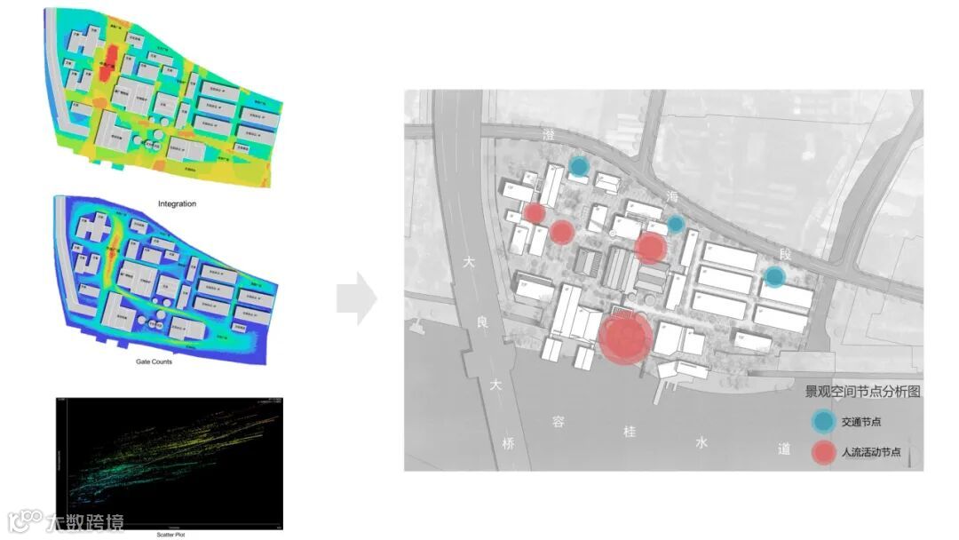 运用空间句法分析工具,分析主要流线焦点,合理布局动静项目,分析设计重点、园林节点等内容。