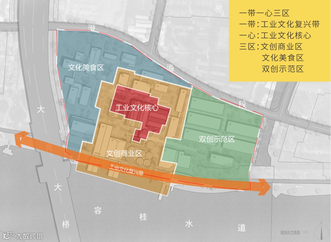 文保单位为核心,联动周边旧有建筑改造,以及新建配套功能建筑,形成一带一心三区的空间结构。