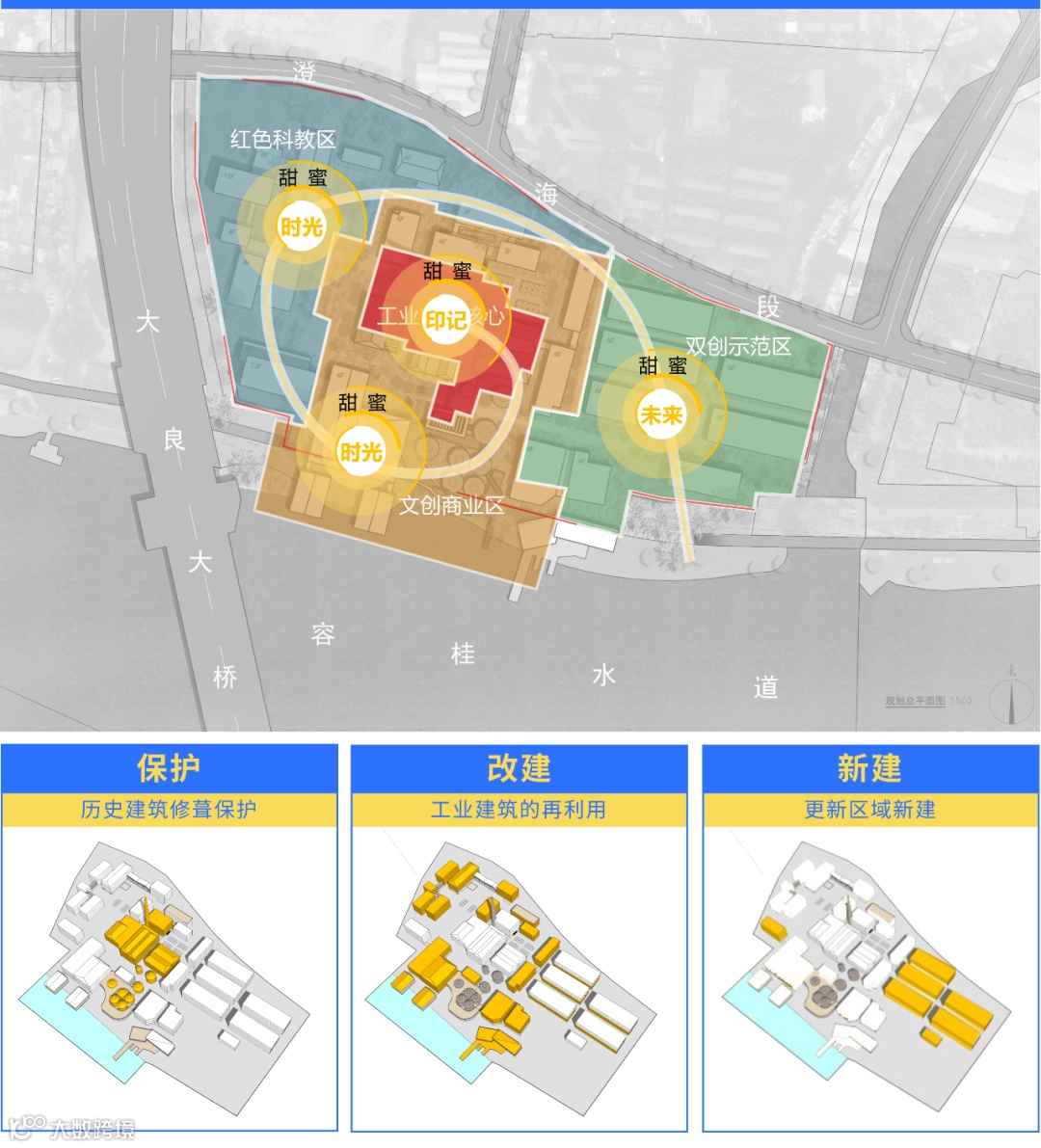 以顺德糖厂的甜蜜事业作为线路,贯穿过去、现在、未来,形成甜蜜印记(工业文化核心)、甜蜜时光(文创商业区)、甜蜜未来(双创示范区)三大主题体验区。