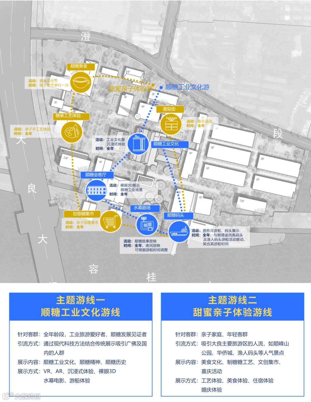 以顺德糖厂甜蜜事业的过去,现在、未来作为线路,打造顺糖工业文化游线、甜蜜亲子体验游线,形成完整的文化体验线路。