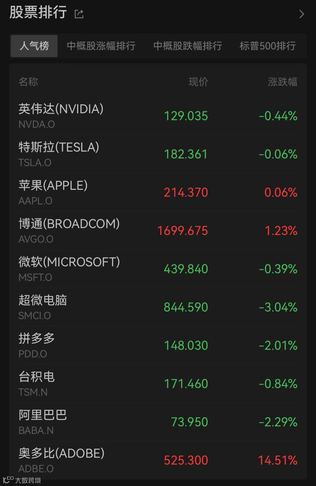 美股三大指数低开后震荡,微软、英伟达、特斯拉等科技龙头均下跌。第二财季业绩好于预期,并上调全年业绩指引的奥多比(ADOBE)大涨近15%,市值增长超300亿美元(合人民币2177亿元)。