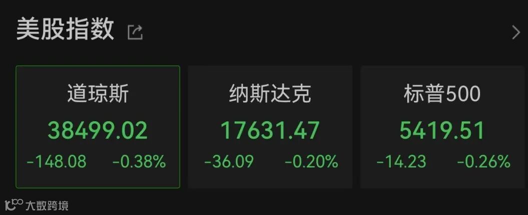 美股三大指数在低开后震荡,截至北京时间21:43,道琼斯工业指数、纳斯达克指数、标普500指数分别下跌0.38%、0.20%、0.26%。