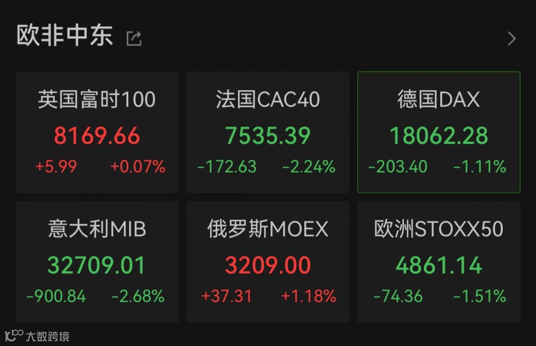 6月14日,欧洲股市继续全线走低,截至发稿,法国CAC40指数跌逾2%,德国DAX指数跌逾1%,意大利富时MIB指数跌逾2%。