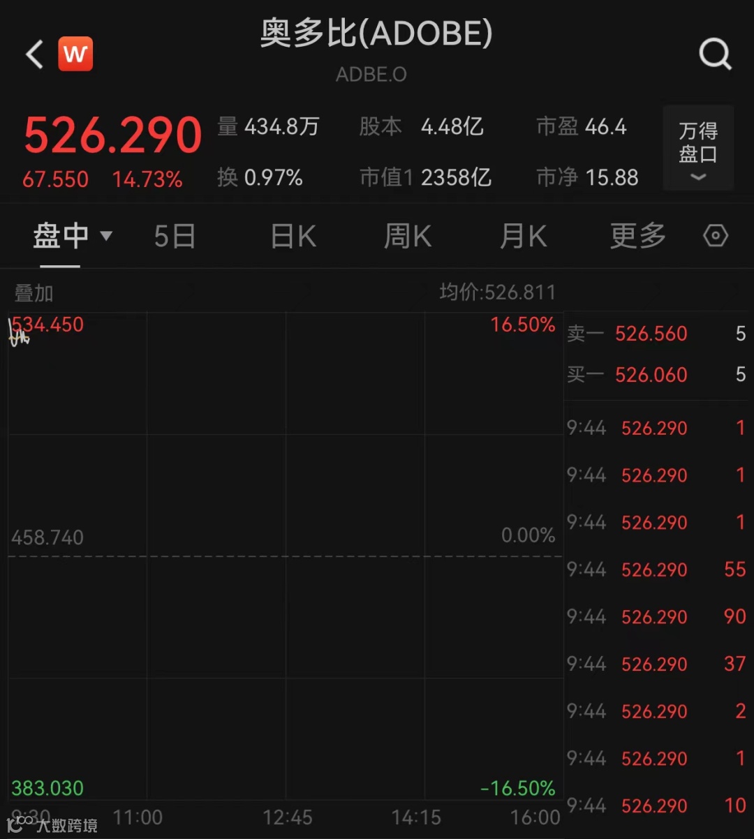 截至北京时间21:44,奥多比(ADOBE)大涨近15%,市值增长超300亿美元(合人民币2177亿元)。