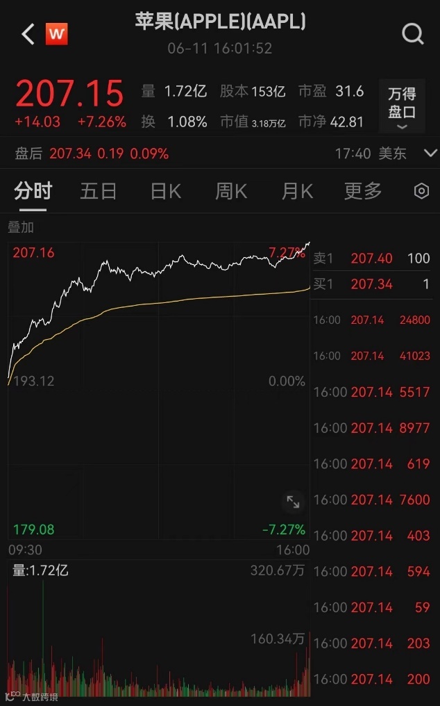 当地时间6月11日,苹果涨7.26%,创历史新高,市值达到31764.55亿美元。
