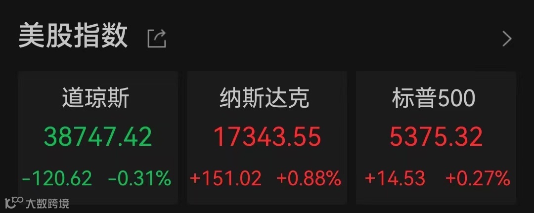 当地时间6月11日,美股三大股指收盘涨跌不一,Wind数据显示,截至收盘,道指跌0.31%报38747.42点,标普500指数涨0.27%报5375.32点,纳指涨0.88%报17343.55点,标普500指数和纳指均创