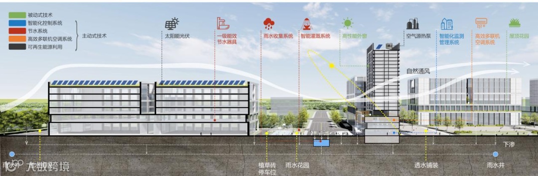 项目遵循“被动优先、主动优化,可再生能源利用”的绿色设计理念,在被动式技术方面:合理规划建筑朝向,提升外窗热工性能、优化外墙、屋面保温性能、在节点上进行热桥和气密性设计,削弱热桥效应,提升外围护结构整体热工性能;在主动技术方面:采用节能照明灯具、高效电机、变频调速技术、智能化控制系统等,降低机电设备的能耗;在建材选择方面:采用可再循环材料、高强钢筋、土建装修一体化设计,实现建筑全生命周期碳减排,打造互联共享的产业家园,营造生态融合的园区氛围。同时,园区内闲置屋面均敷设太阳能分布式光伏,热水供应采用空气源热泵系统,充分挖掘与利用可再生能源,减少对化石能源的依赖。