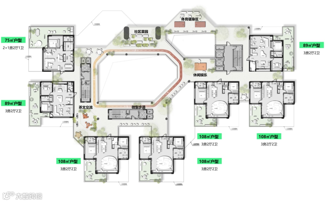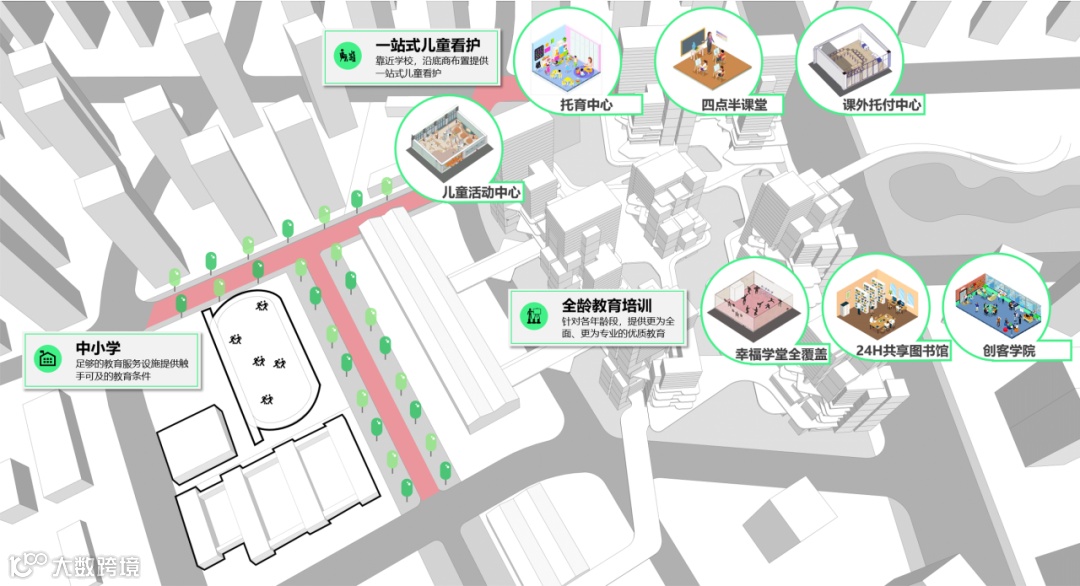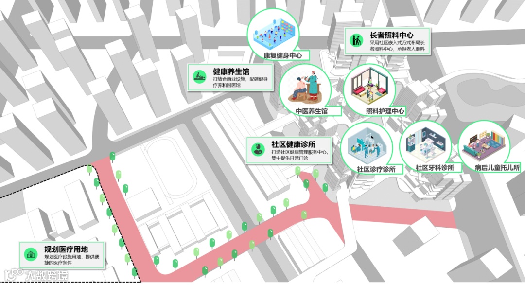 整合教育文化资源,新建图书馆、创客学院、幸福学堂、托育中心等,实现“全龄化”教育覆盖。社区运动系统,将跑道、运动场、游憩场等场地串联成运动社交场所,激发社区活力,能让参与者得到运动与社交带来的加倍满足。整合医疗资源,新建长者照料中心、社区健康诊所、健康养生馆等,打造全龄化健康医疗服务。