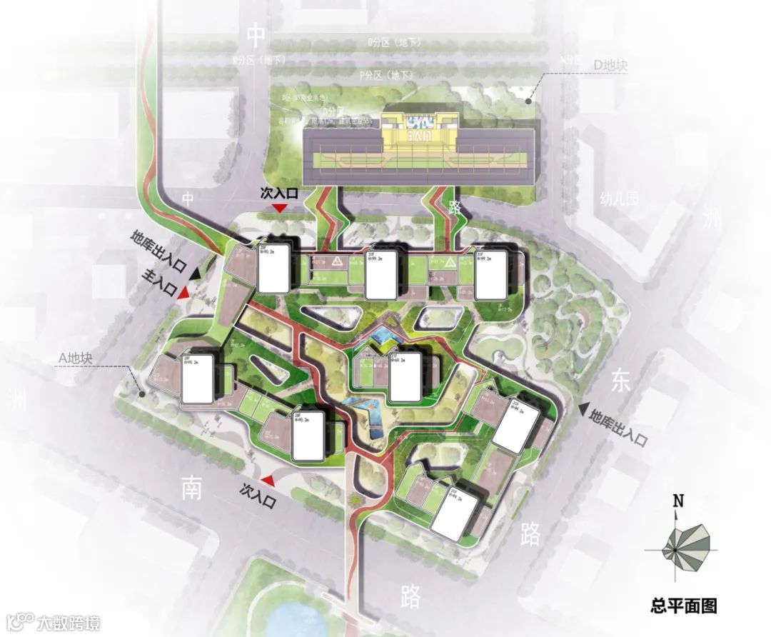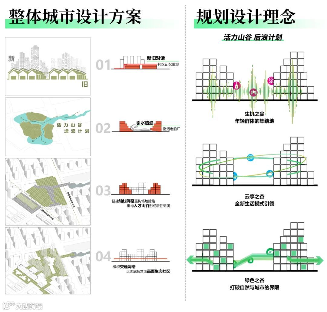 以“活力山谷,造浪计划”为设计思路,通过“引水造浪”焕新老船厂空间活力。搭建轴线网格重构场地脉络,在A地块形成人才山谷居住组团,编织两地块多维立体交通网络,大面底板营造高面生态社区。