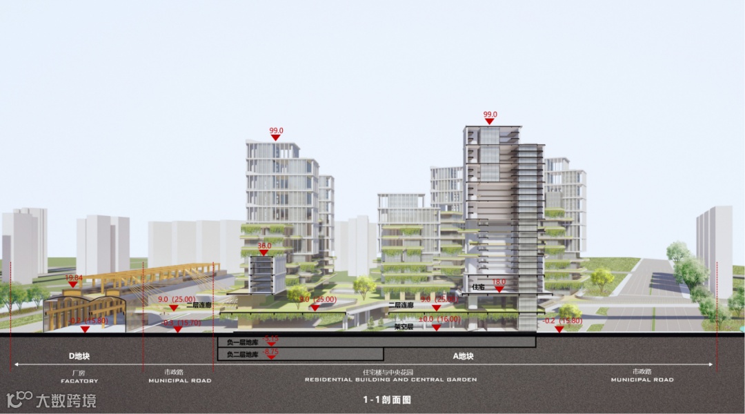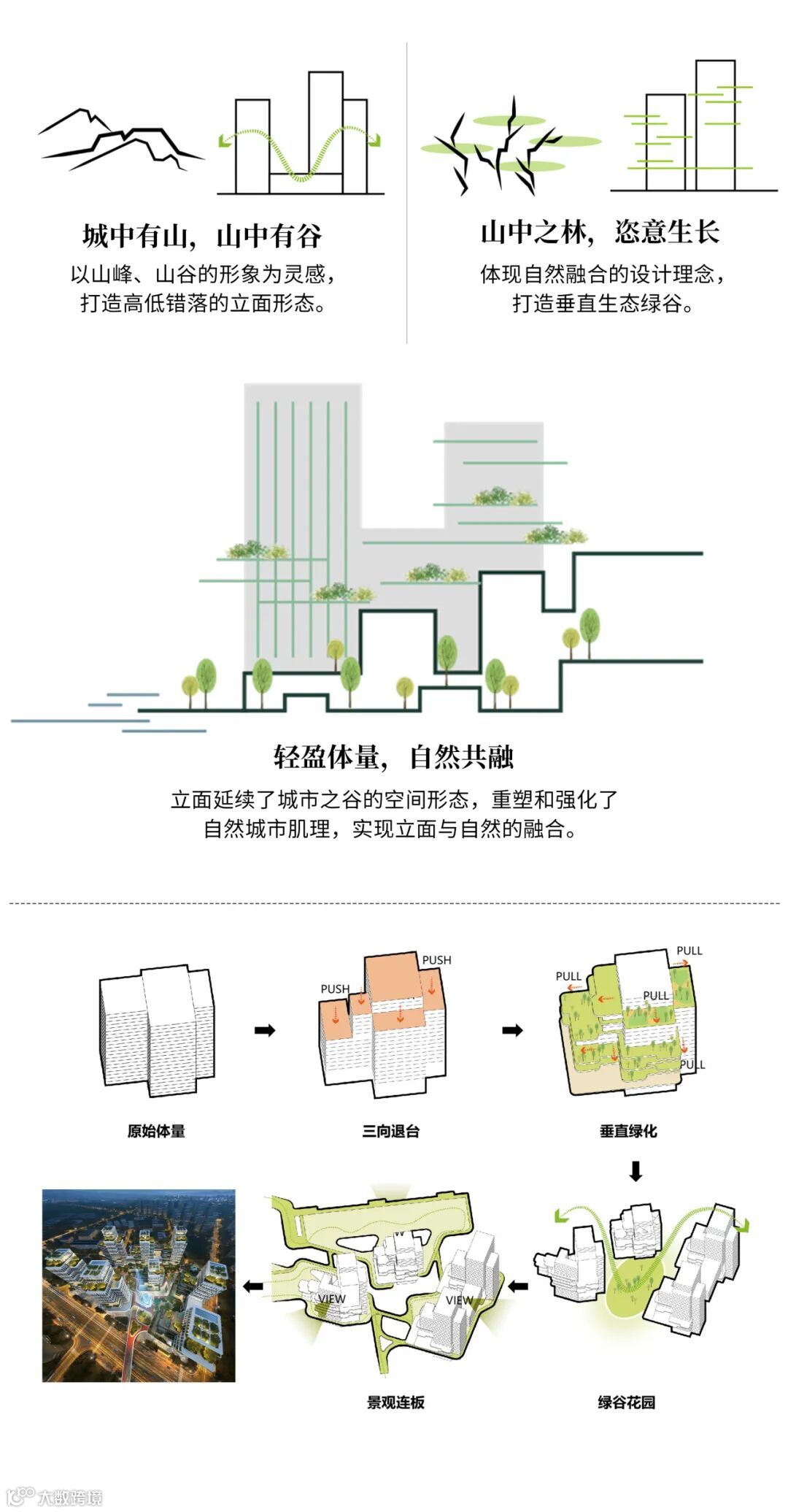 立面以群山为灵感,通过高低、形态的变化与组合,采用地面、平台与屋顶垂直绿化相结合的方式,打造了一个立体多层次的城市绿谷形象。