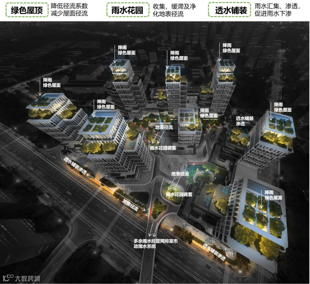 在设计中充分融入海绵城市建设理念,通过设置绿色屋顶、雨水花园、透水铺装、雨水收集与回收系统,实现控制雨水径流量、节约水资源及景观功能。