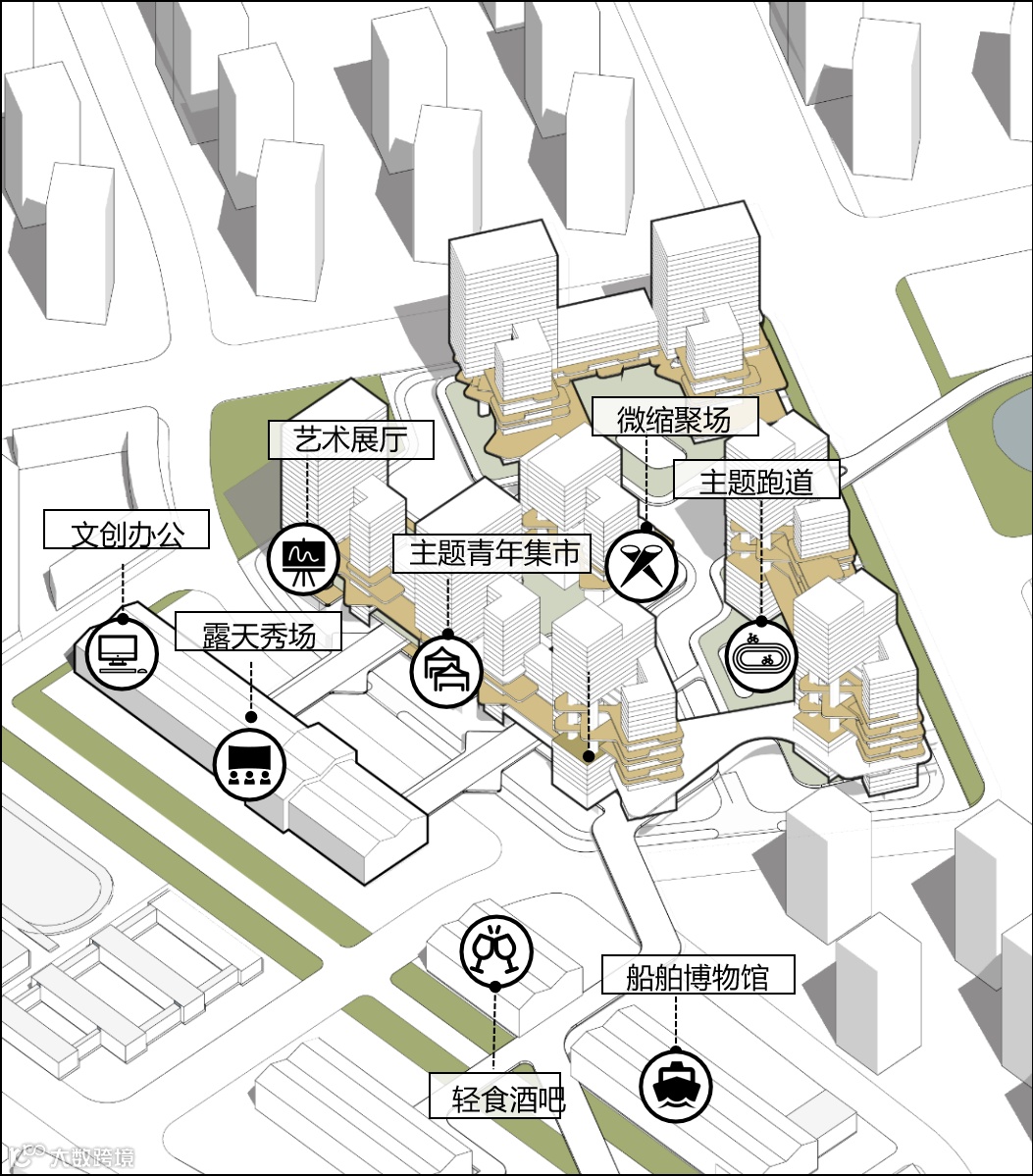 以工业记忆符号为元素,激活主题性特色商业街区,吸引人群。赋予多元业态高效组合,形成多场景集合的城市美好生活聚点。