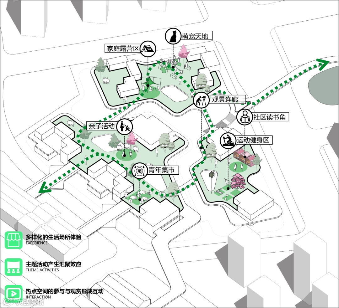 因地制宜的构建以社区中心绿廊为骨架的空间结构,连接住区与公园、城市绿轴,并营造出一系列亲切、实用、功能灵活的景观绿化空间。