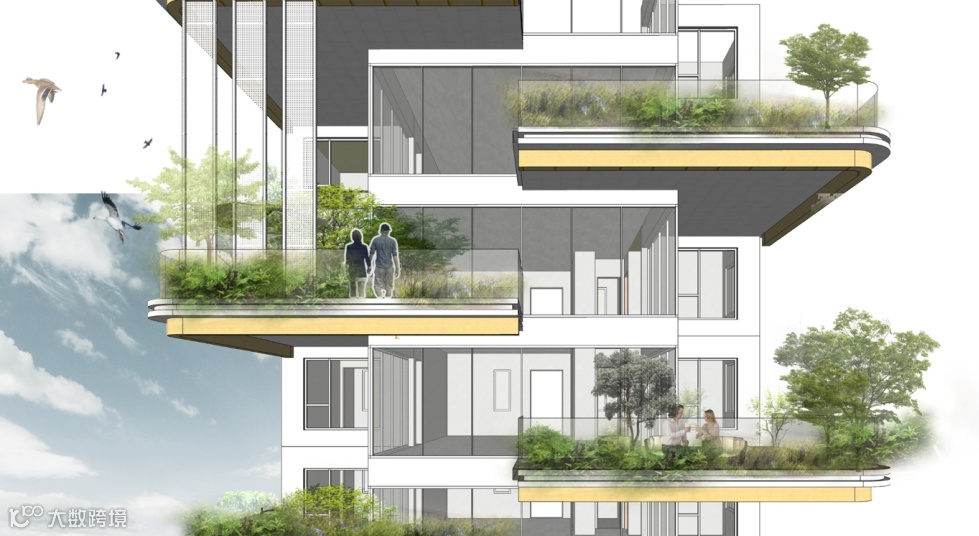 融合大区庭院绿化、宅间平台绿化、空中花园绿化、退台绿化、垂直绿化、屋顶花园绿化等多个绿色生态场景,打造多层次的绿化开放空间系统,降低场地热岛效应,创造有利的场地微气候,降低建筑外围护结构表面温度与室内空调负荷,节能环保。