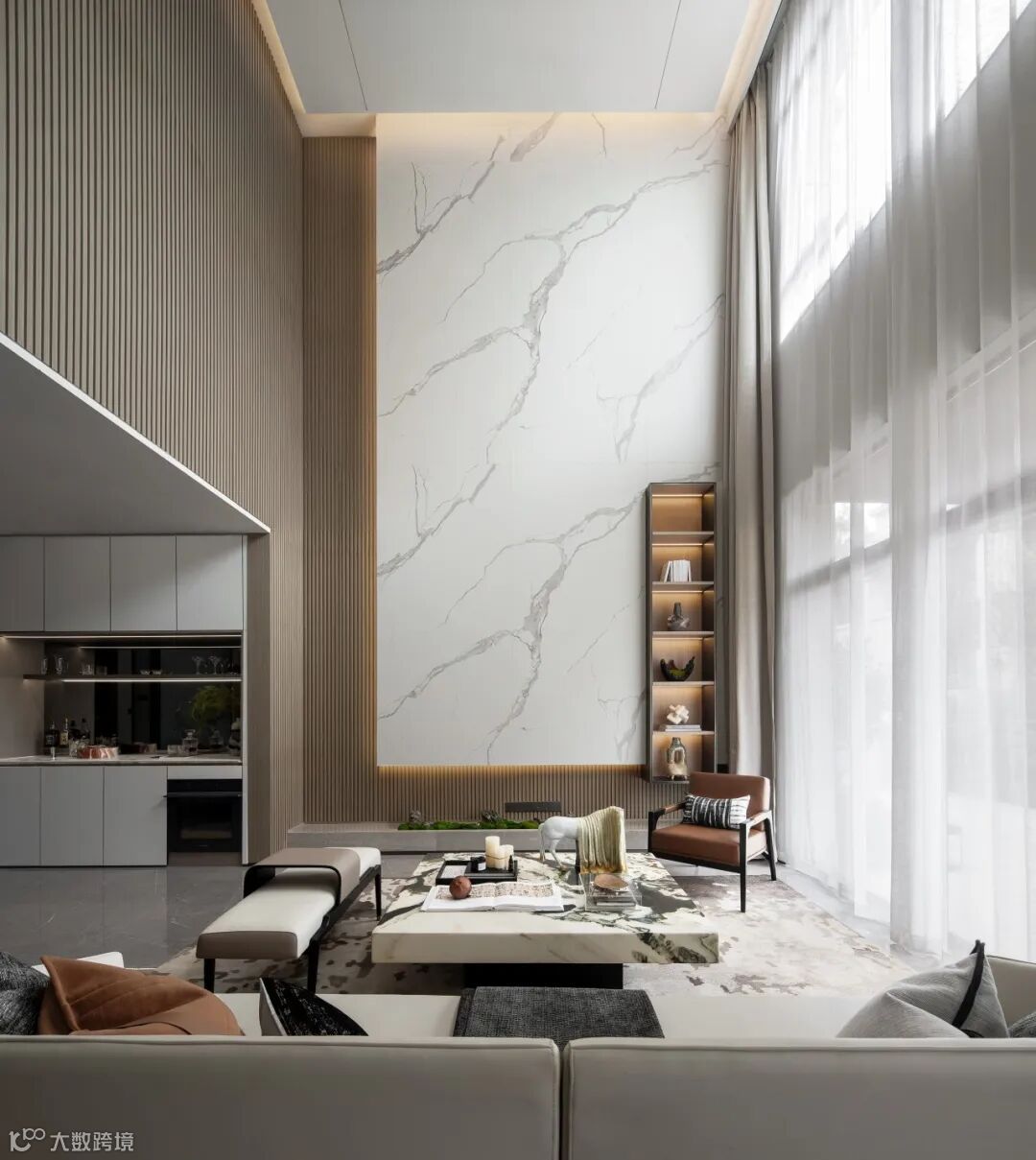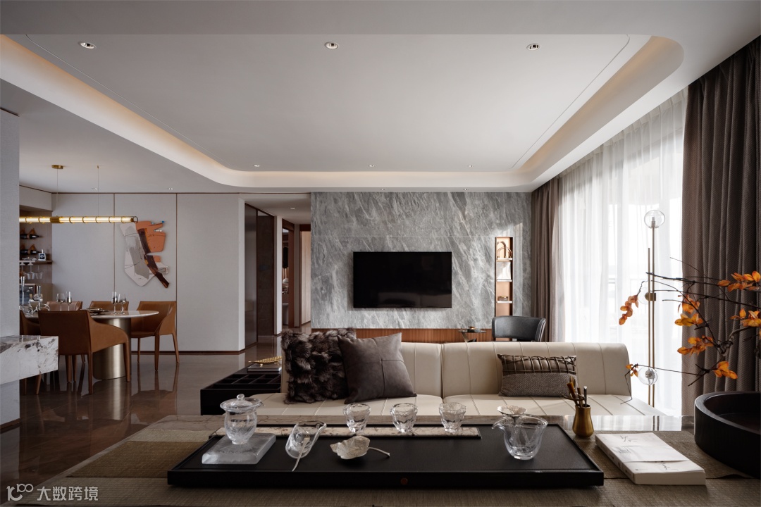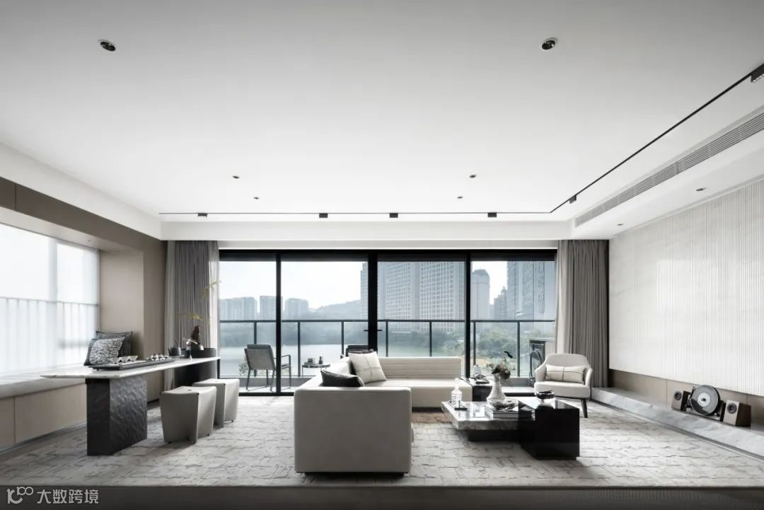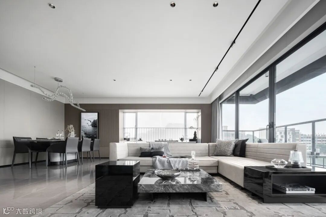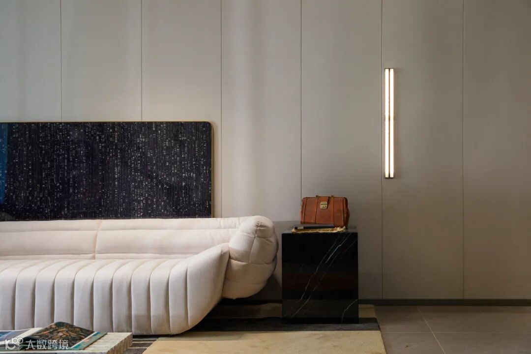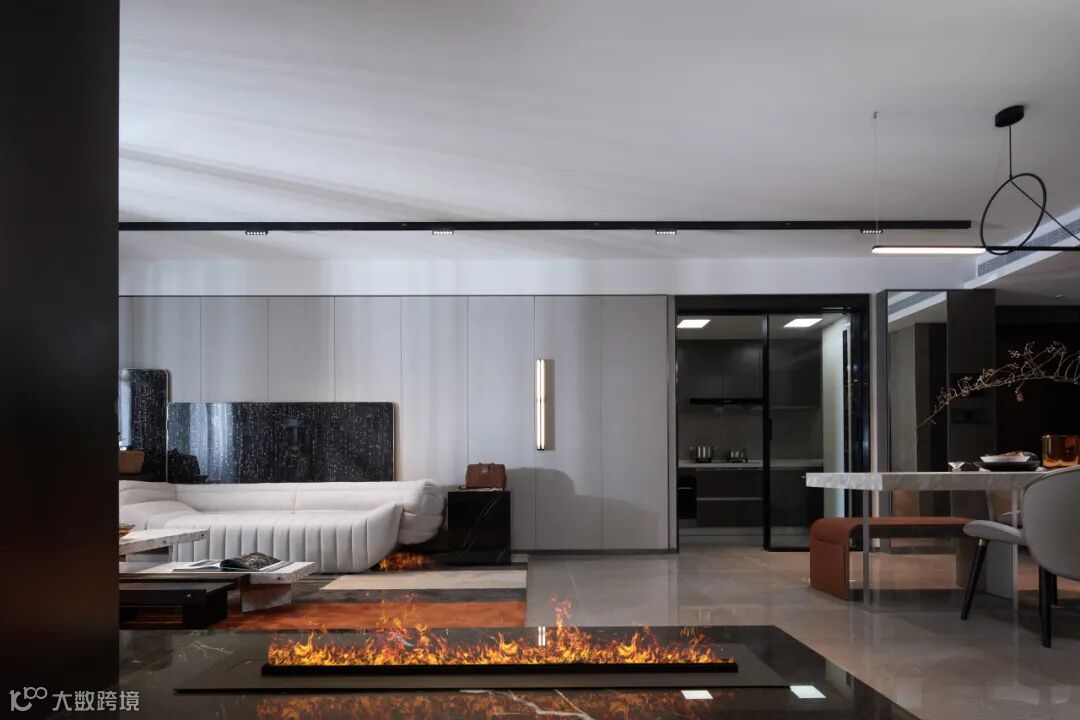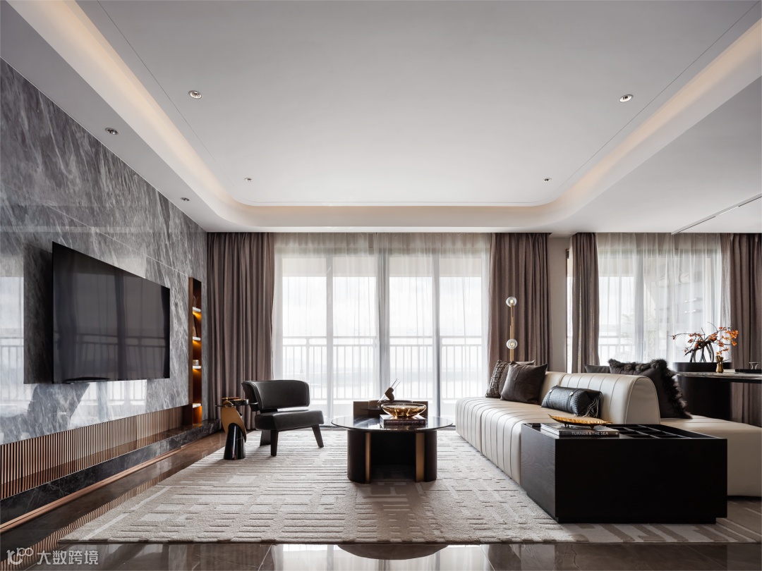该户型主要面向居住升级改善类人群,空间以黑白灰的中性气质为基底,辅以反射性的天然石材与金属质感材料,暗示出空间的干练与硬朗,使得整个家居空间散发出强烈的现代审美与精英气质。