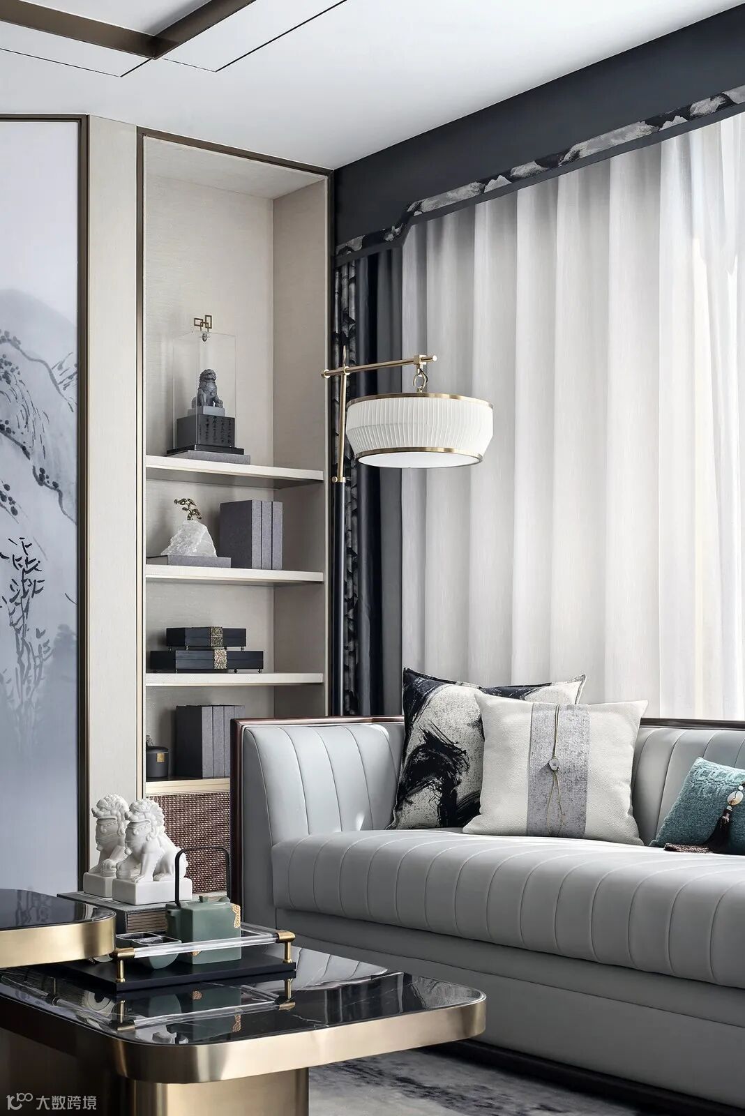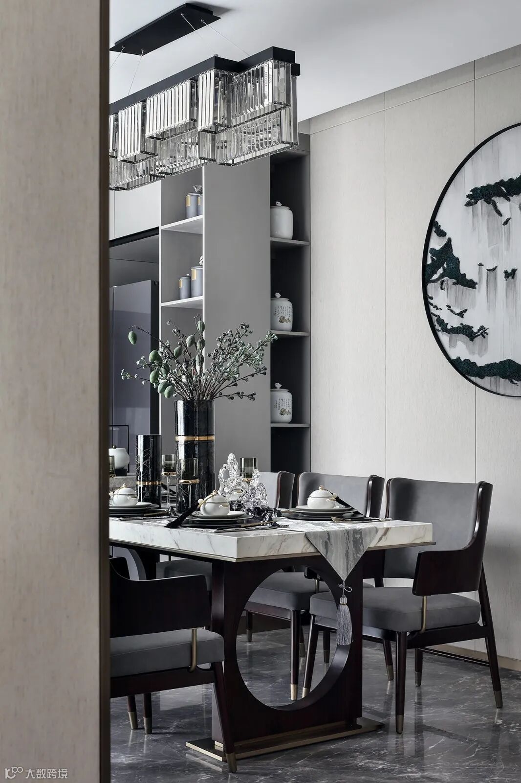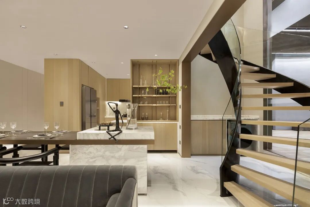 吊灯弧度划破其中,灵动的玻璃软装以及黑、白、木色的穿插,打造了集温润和理性于一体的空间。