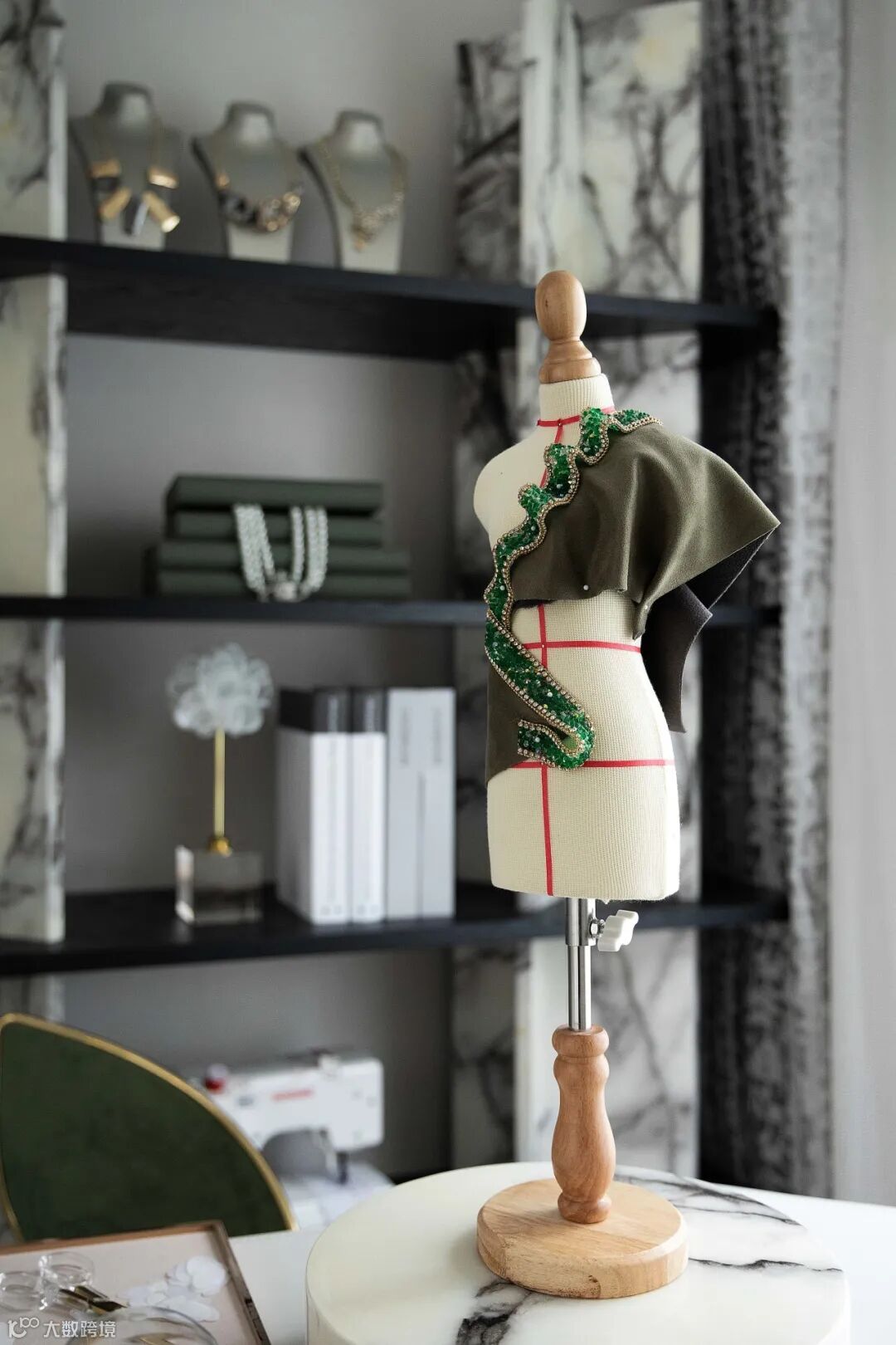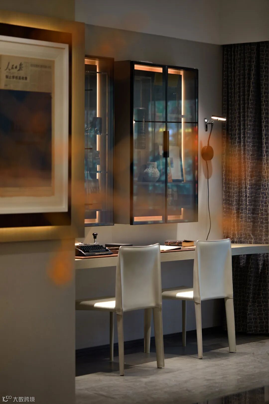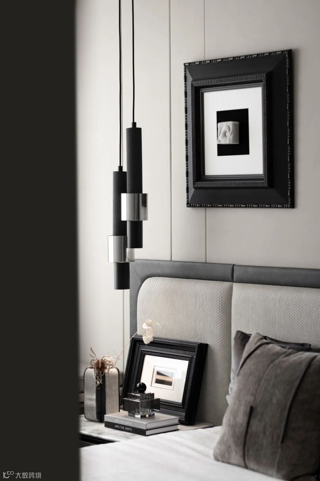 吊灯弧度划破其中,灵动的玻璃软装以及黑、白、木色的穿插,打造了集温润和理性于一体的空间。