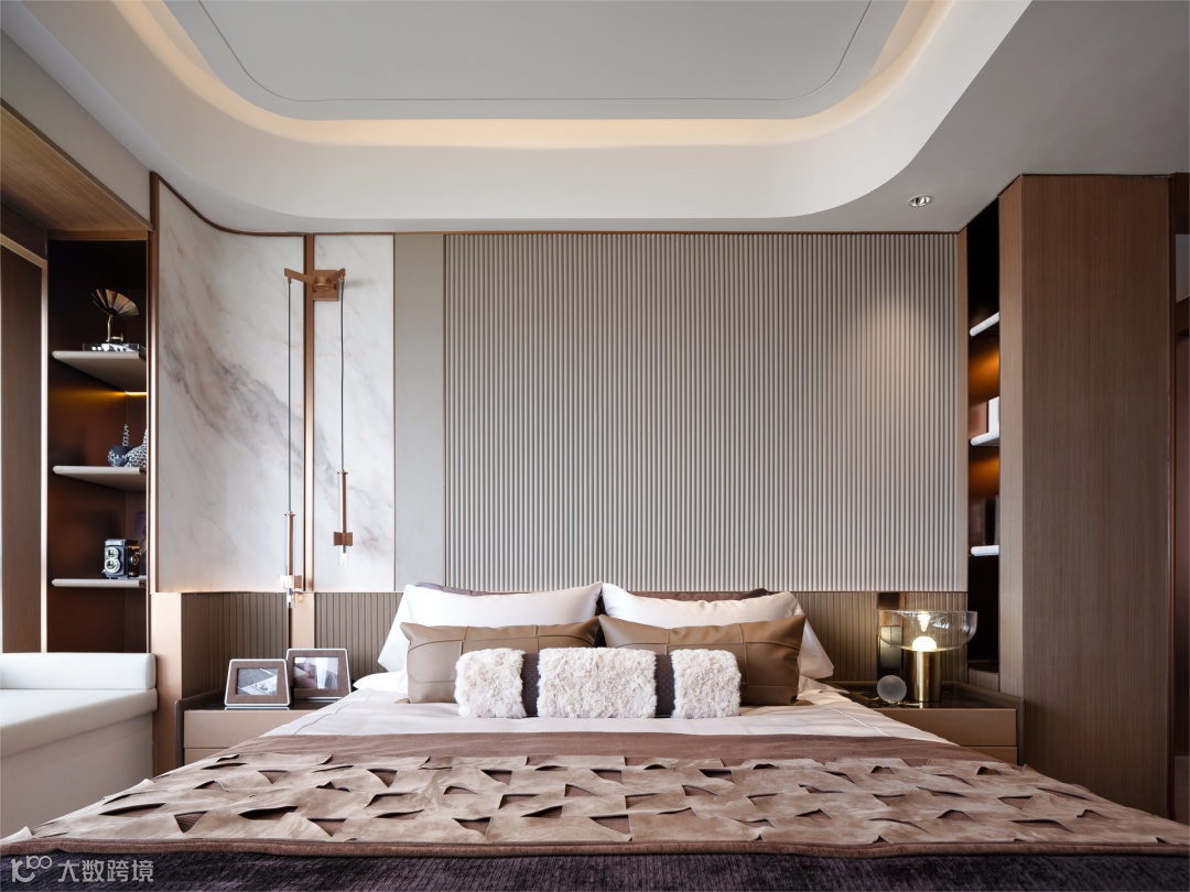 餐厅以繁心梦悦的视觉体验,延续客厅诗意的浪漫,在餐厅处选用浪漫带有宫廷风格的饰品,家具选型也是呼应这一主题。主卧延续主基调,精致而纯粹的细节设计。弧形背景墙增添趣味性,搭建一个无限包容的舒适空间。