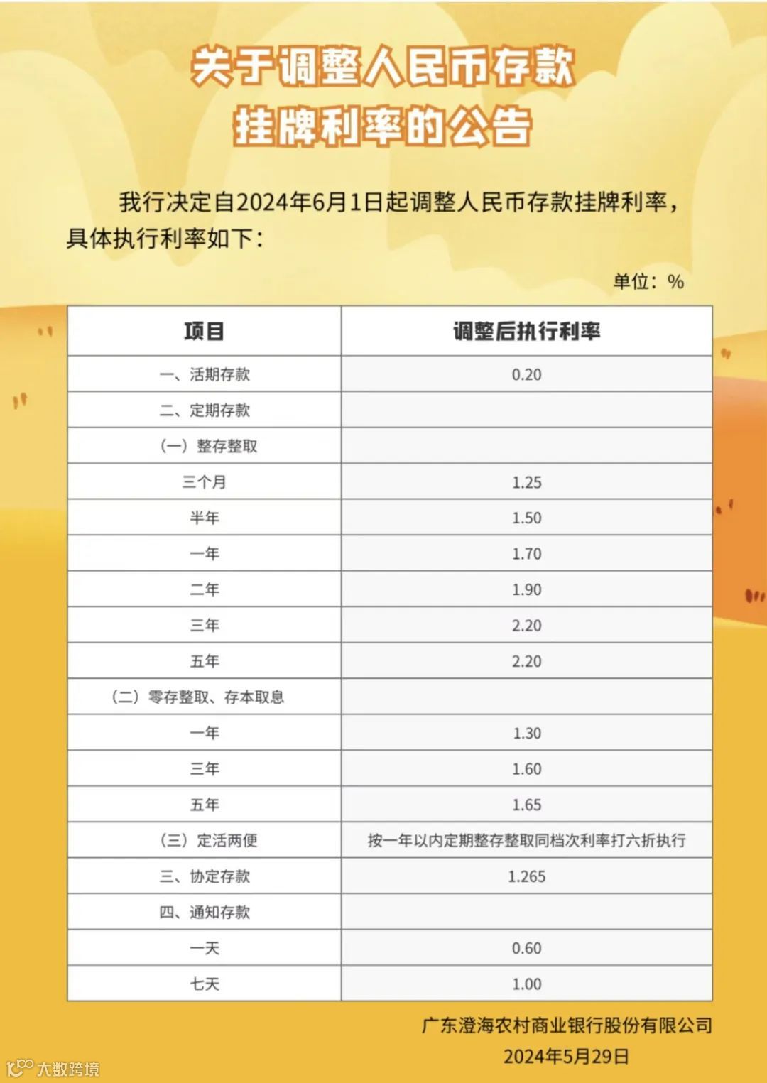 “我行决定自6月1日起调整人民币存款挂牌利率。”日前,广东澄海农商银行发布公告称。调整后,该行三个月、半年期、一年期、二年期、三年期、五年期整存整取定存利率分别为1.25%、1.50%、1.70%、1.90%、2.20%、2.20%。