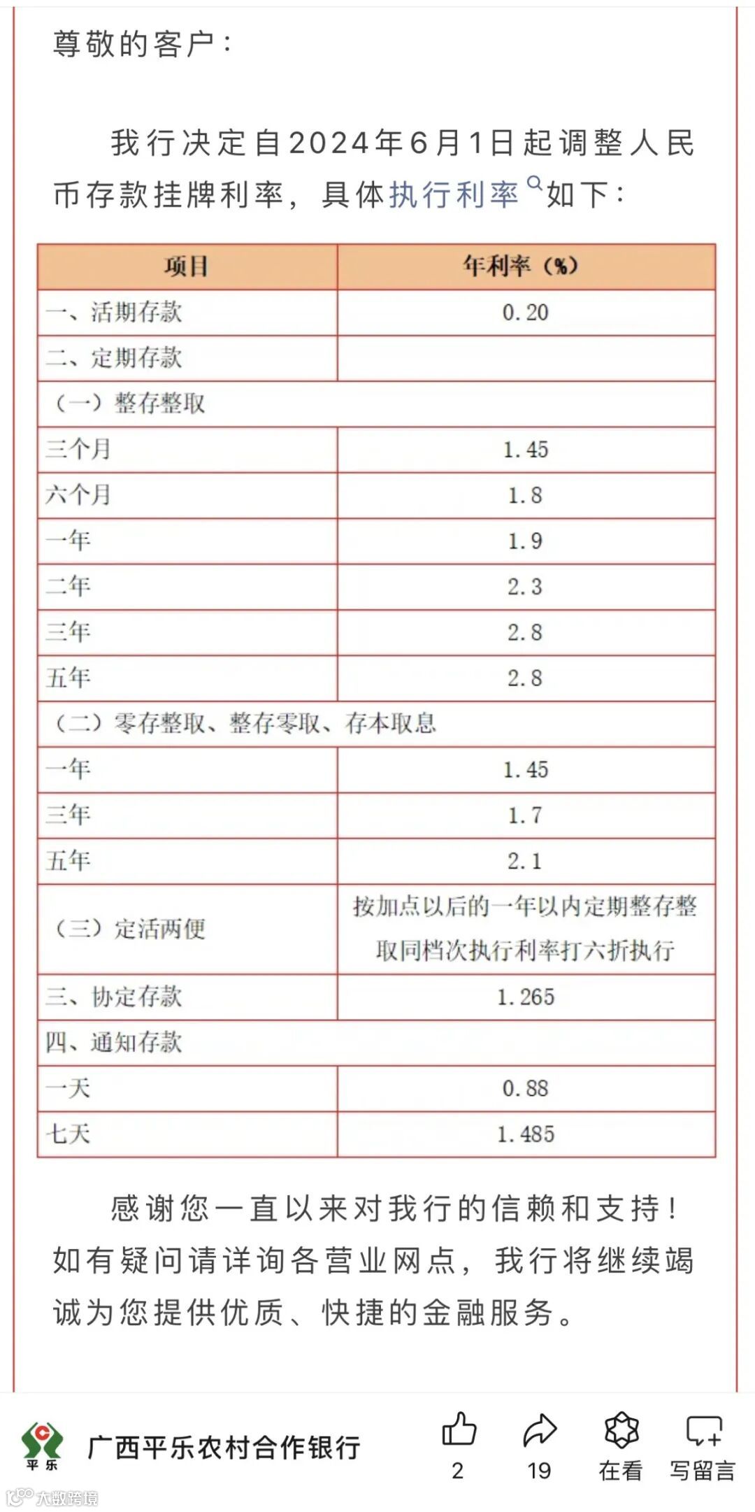 广西平乐农村合作银行也发布公告称,自6月1日起调整人民币存款挂牌利率,调整后的三个月、六个月、一年期、二年期、三年期、五年期整存整取定存利率分别为1.45%、1.8%、1.9%、2.3%、2.8%、2.8%。
