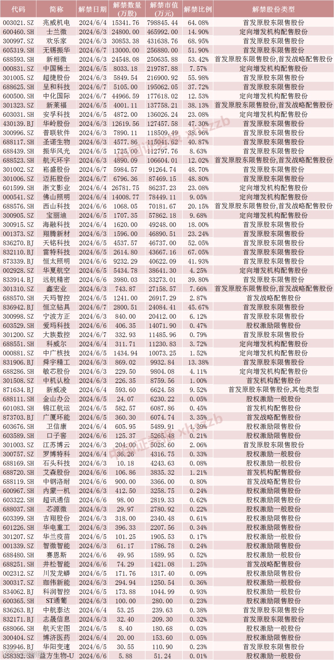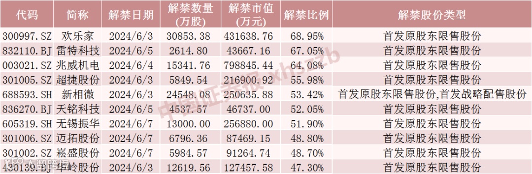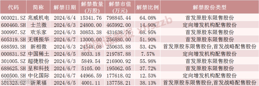 具体来看,Wind数据显示,兆威机电6月4日将解禁1.53亿股,均为首发原股东限售股份。士兰微6月3日将解禁2.48亿股,均为定向增发机构配售股份。欢乐家6月3日将解禁3.09亿股,均为首发原股东限售股份。
