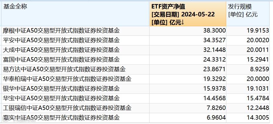 首批10只中证A50ETF最新规模