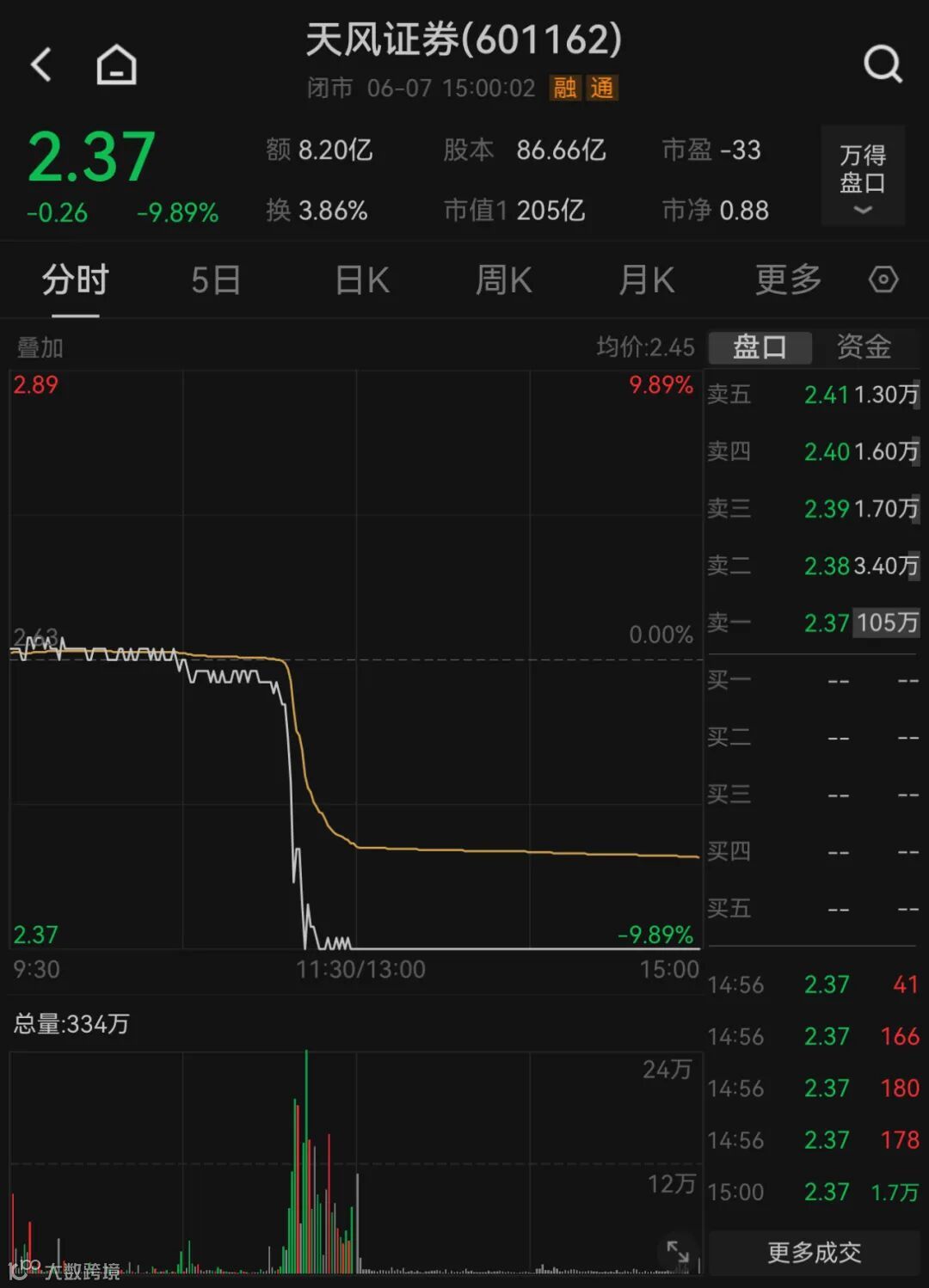 此外,天风证券今天上午“闪崩”跌停,收盘价为2.37元/股。