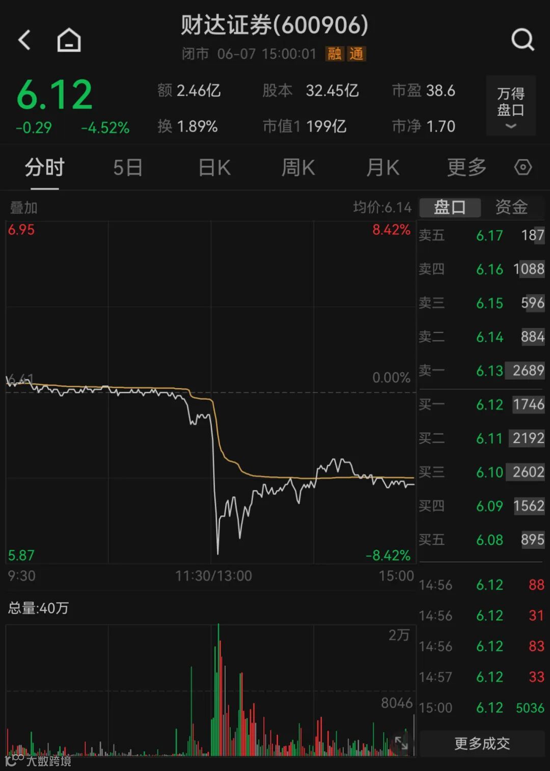 财达证券午后突然跳水,一度跌超8%,截至收盘,跌幅为4.52%。
