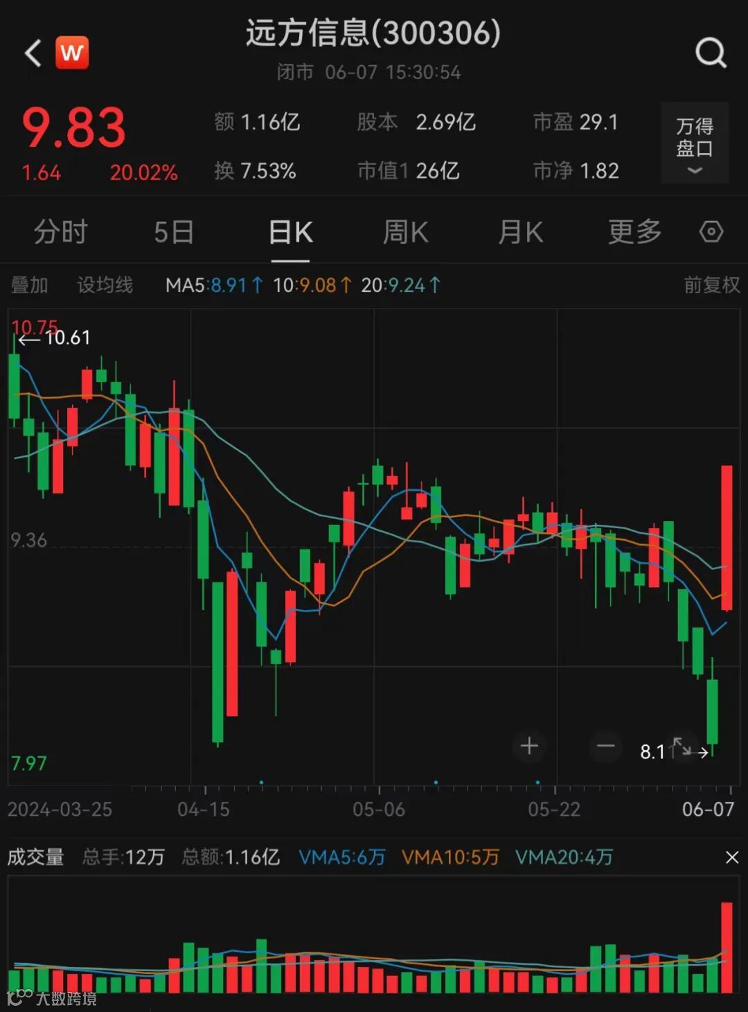 此前股价连续下跌的远方信息今天高开后“闪电”20CM涨停,最新市值约26亿元。