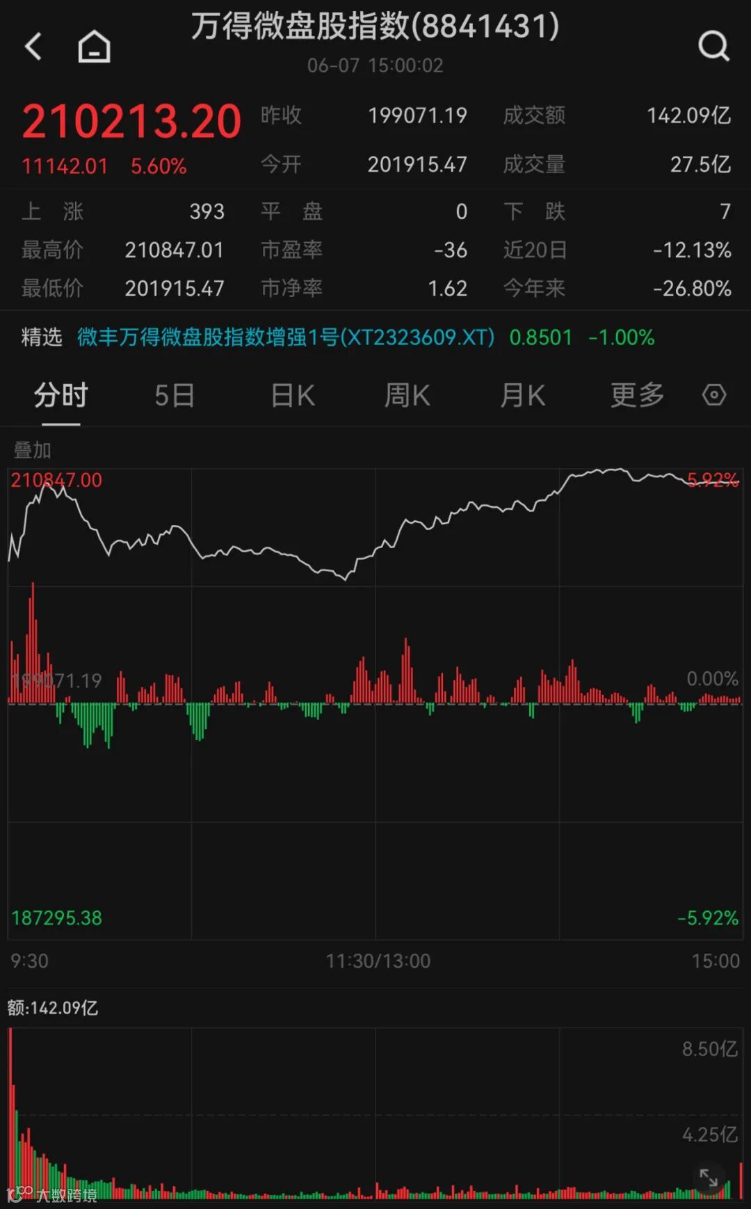 今天,微盘股涨幅始终居前。截至收盘,微盘股指数大涨5.6%。