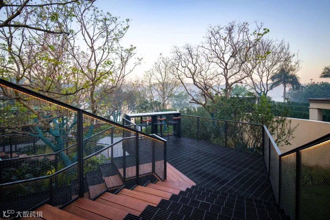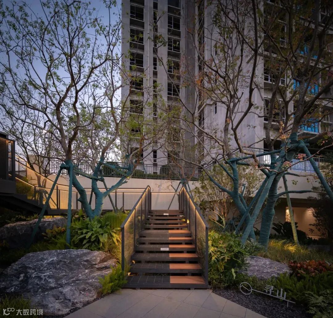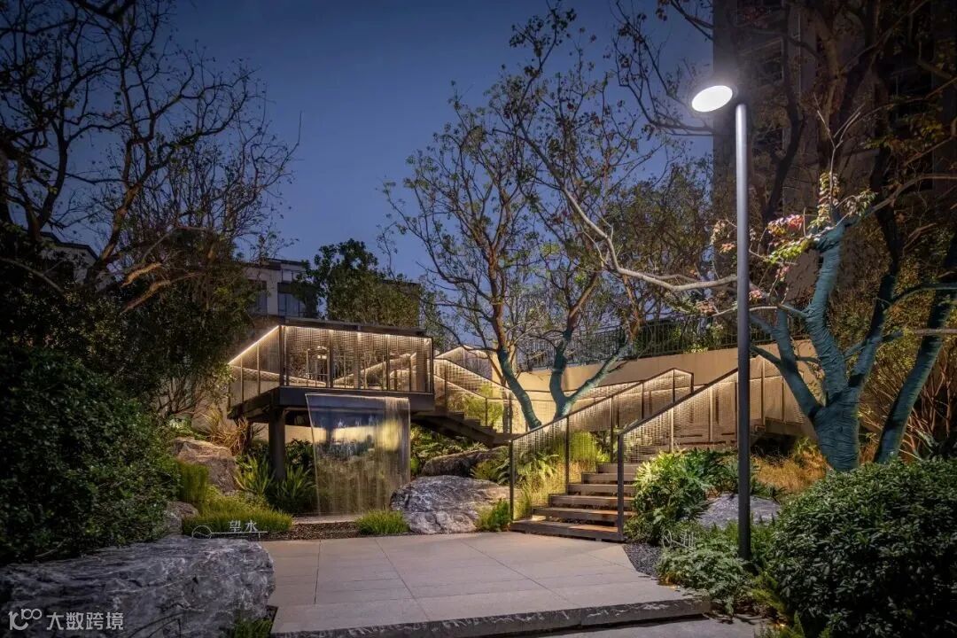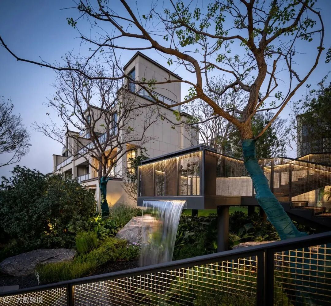 过去一段时期,城市及房地产市场的快速发展,出现了许多大拆大建的临时展示景观,场地本身就是为了展示效果而生。但我们认为园林景观的空间营造更应该是一种生活场景的打造,是顺应场地本身基底,通过适量、低干扰的设计策略,以因地制宜、自然而然的手法进行景观设计与建设,展示自然与人工结合的景观空间,实现人与自然和谐。美的鹭湖森林度假区·星澜项目,是我们在美的森林度假区里面的一块场地,非常难得有一个6米多高的错层,同时一面临湖,在这样一个周边环境资源丰富的空间,尊重场地本身的特质,突出自然,借景自然也是首选的策略,所以我们通过一个架空的钢梯,链接场地,解决竖向的高差问题,同时附加远眺望湖平台及流瀑景观,自然形态的树木及置石,所有硬质铺地及台阶采用自然朴实的做法,尽量去营造一个贴近自然生态的环境,通过自然窥见自然,营造一个轻松惬意的休闲场所。