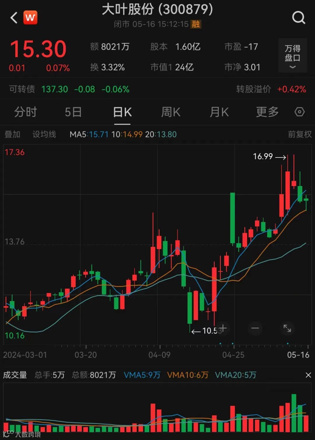 截至5月16日收盘,大叶股份股价报15.3元/股,总市值约24亿元。