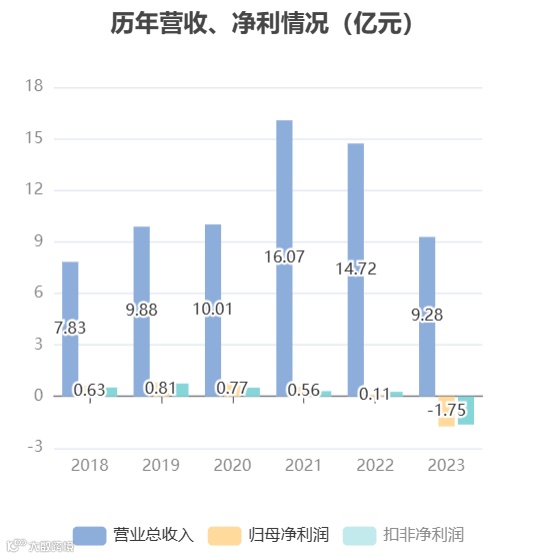 年报显示,2023年,大叶股份实现营业收入9.28亿元,同比下降36.91%;实现归属于上市公司股东的净利润-1.75亿元,同比下降1654.26%。
