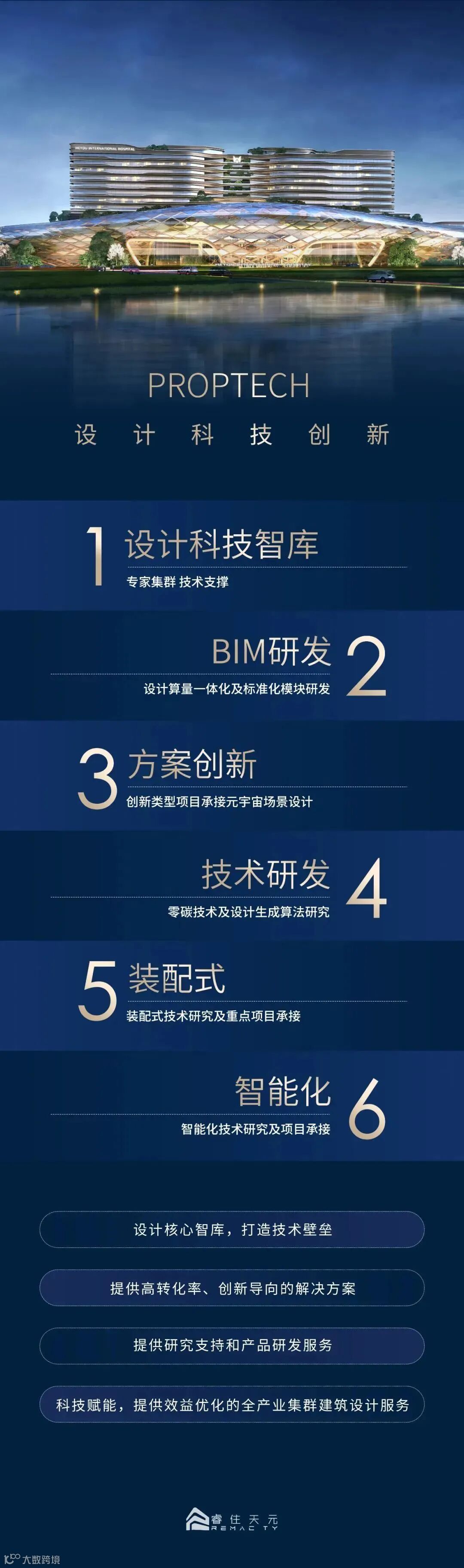 睿住天元围绕国家“双碳”目标,拓展新型建筑工业化和数字化设计双航道。以设计拥抱科技,立足突破创新,坚持品质提升,开展绿色设计与数字化设计,打造一站式“装配式+BIM+智能化”设计项目。经近三十年实践积累,落地项目超过2000个,数字化设计总面积超6000万平方米,获得专利授权并转化科技成果41项,企业荣誉获得超200项。