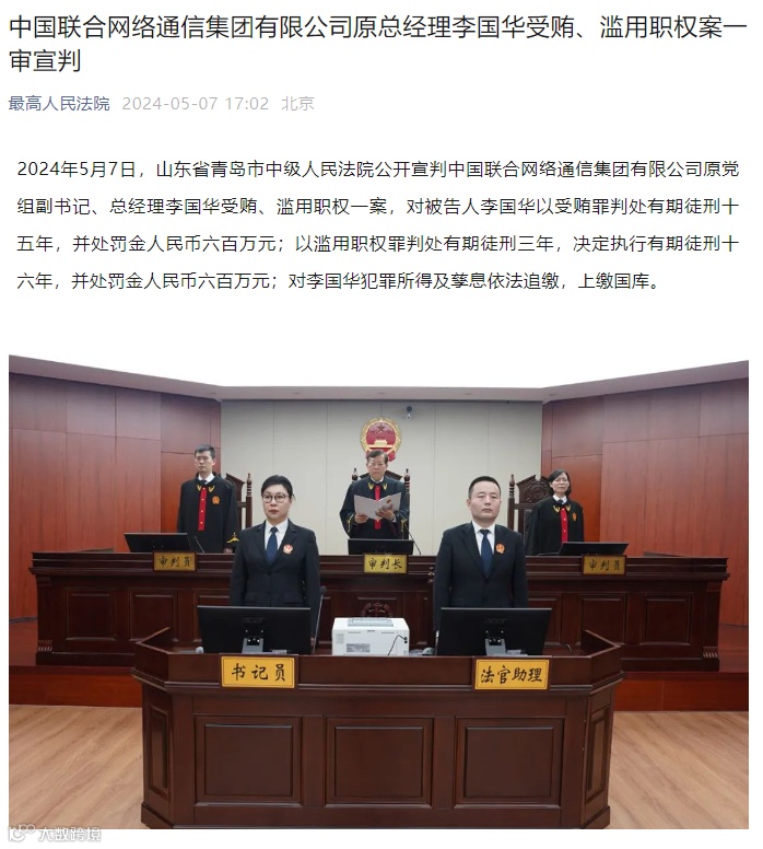 市中级人民法院公开宣判中国联合网络通信集团有限公司原党组副书记、总经理李国华受贿、滥用职权一案,对被告人李国华以受贿罪判处有期徒刑十五年,并处罚金人民币六百万元;以滥用职权罪判处有期徒刑三年,决定执行有期徒刑十六年,并处罚金人民币六百万元;对李国华犯罪所得及孳息依法追缴,上缴国库。