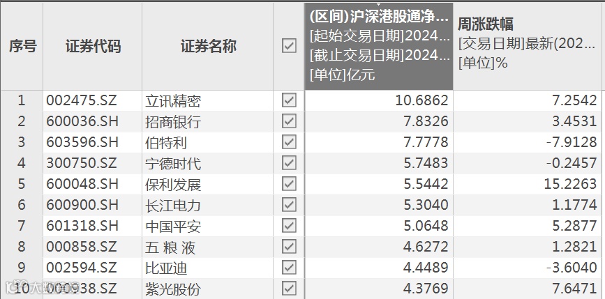 本周北向资金持仓市值增加额居前十的股票均上涨,保利发展涨幅最大,立讯精密、工业富联本周均涨逾7%。