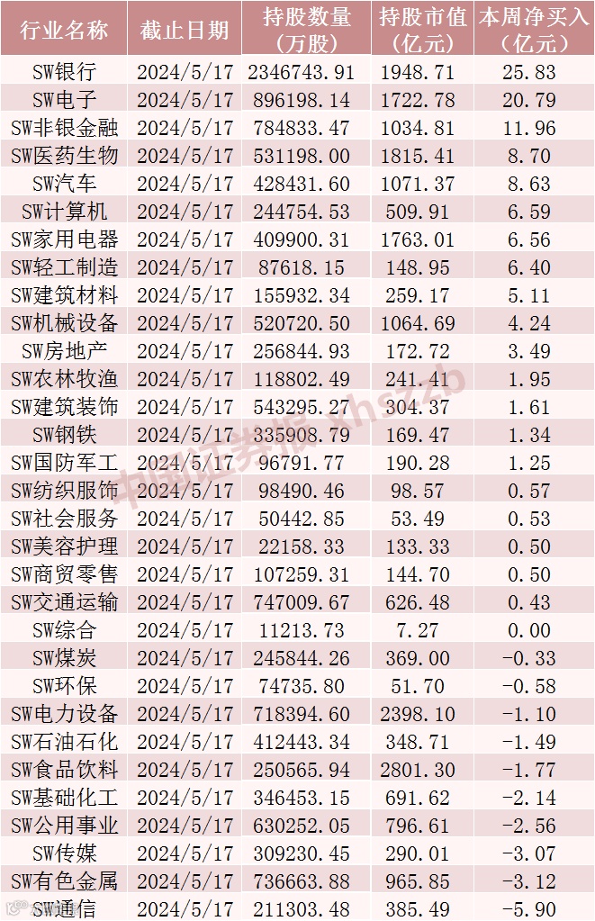 。行业方面,本周北向资金加仓银行、电子行业均超20亿元。