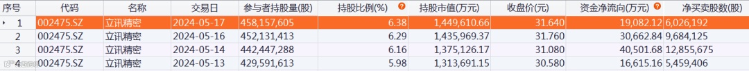 北向资金持股立讯精密明细数据
