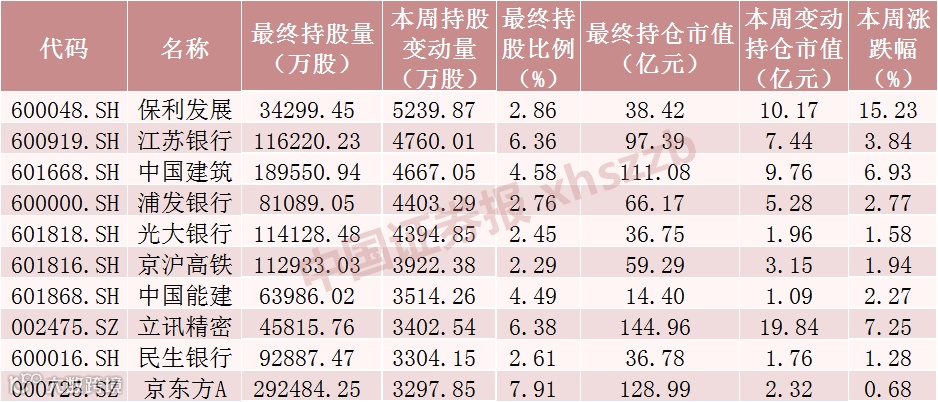 本周北向资金持股增加数居前十的股票均上涨,保利发展涨幅最大,全周上涨15.23%。
