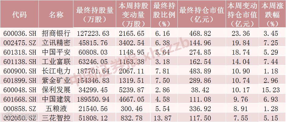 本周北向资金持仓市值增加额居前十的股票均被北向资金加仓,其中增持招商银行、立讯精密、长江电力、保利发展、中国建筑均超2000万股。