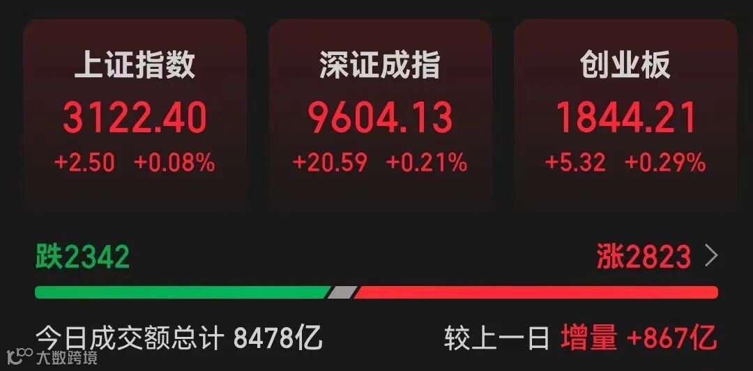 A股三大指数全天冲高回落。上证指数尾盘突然下挫并一度翻绿,不过14分钟后再度翻红,最终收涨0.08%。深证成指涨0.21%,创业板指涨0.29%。全市场超2800只个股上涨。沪深两市今日成交额8478亿元,较上个交易日放量867亿元。