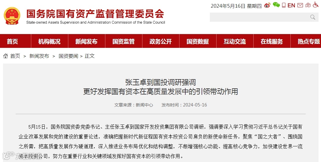据国务院国资委网站5月16日消息,5月15日,国务院国资委党委书记、主任张玉卓到国家开发投资集团有限公司调研,强调要深入学习贯彻习近平总书记关于国有企业改革发展和党的建设的重要论述,准确把握新时代新征程国有资本投资公司肩负的新使命新任务,聚焦“国之大者”、围绕国之所需,把高质量发展作为硬道理,深入推进业务布局优化和结构调整,不断增强核心功能、提高核心竞争力,加快建设世界一流资本投资公司,努力在重要行业和关键领域发挥好国有资本的引领带动作用。