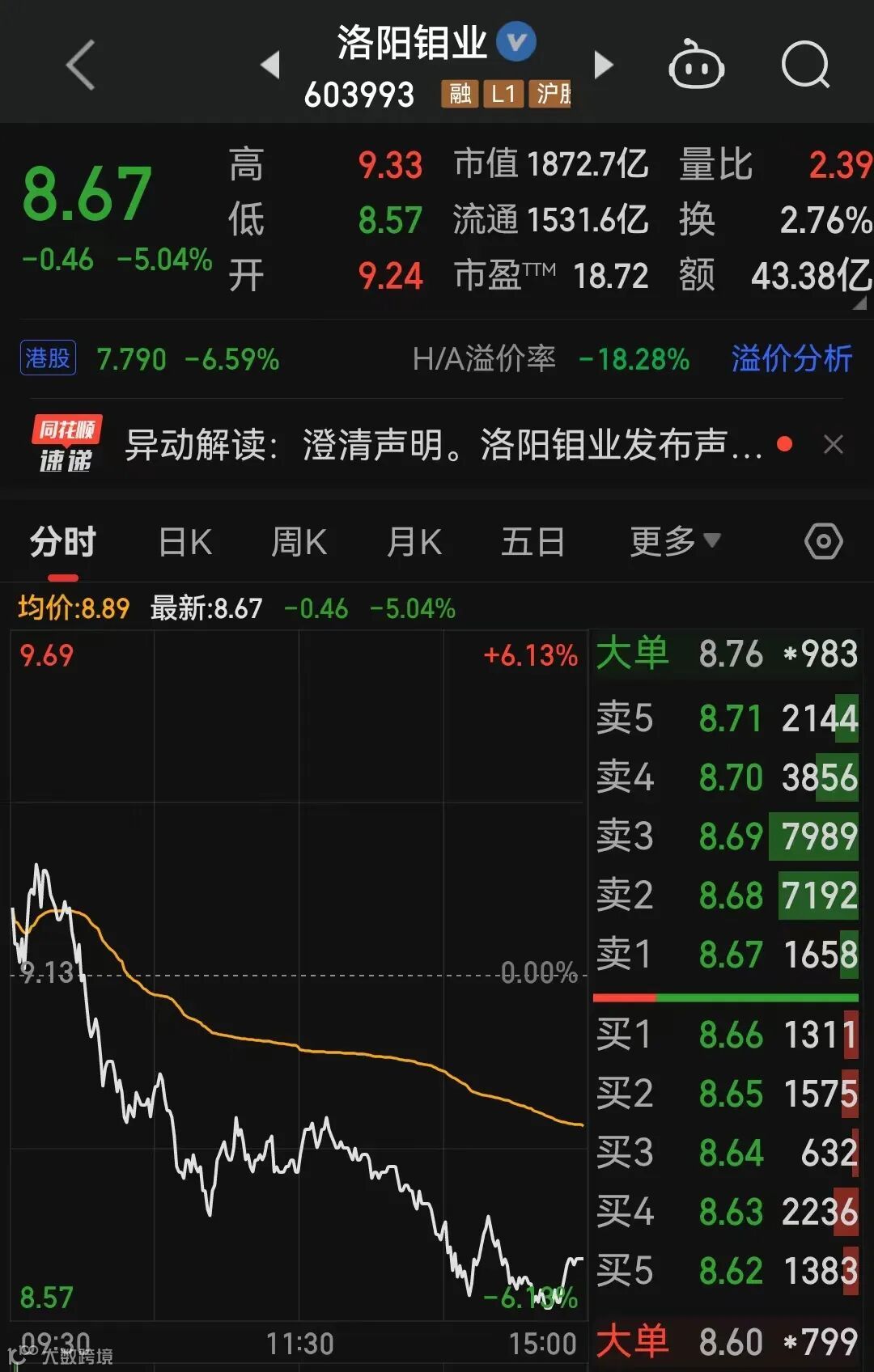 截至收盘,洛阳钼业跌5.04%,最新市值为1873亿元。