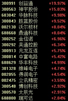 铜缆高速连接板块异军突起,涨幅居前。其中,创益通“20CM”涨停,神宇股份涨逾15%,华脉科技涨停,胜蓝股份、沃尔核材、鼎通科技涨逾8%,金信诺、吴通控股、兆龙互连等股跟涨。