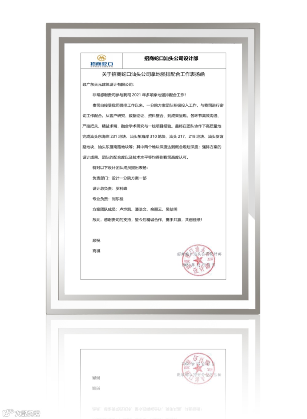 招商蛇口在表扬信中,对睿住天元建筑方案团队在支持汕头公司拿地设计前置工作,以市场溢价优先导向为原则,对规划和产品进行了精准的且多维度的研发和创新,将产品价值最大化提出了肯定,并对专业高效的配合过程高度认可。