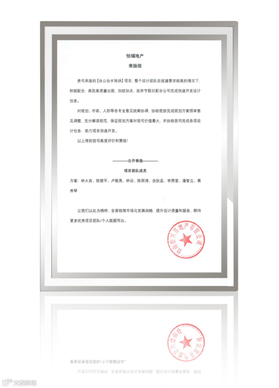 怡福地产在表扬信中表示,睿住天元建筑方案团队在【台山合水地块】项目中积极配合,呈现高效高质量设计出品,取得满意的效果。