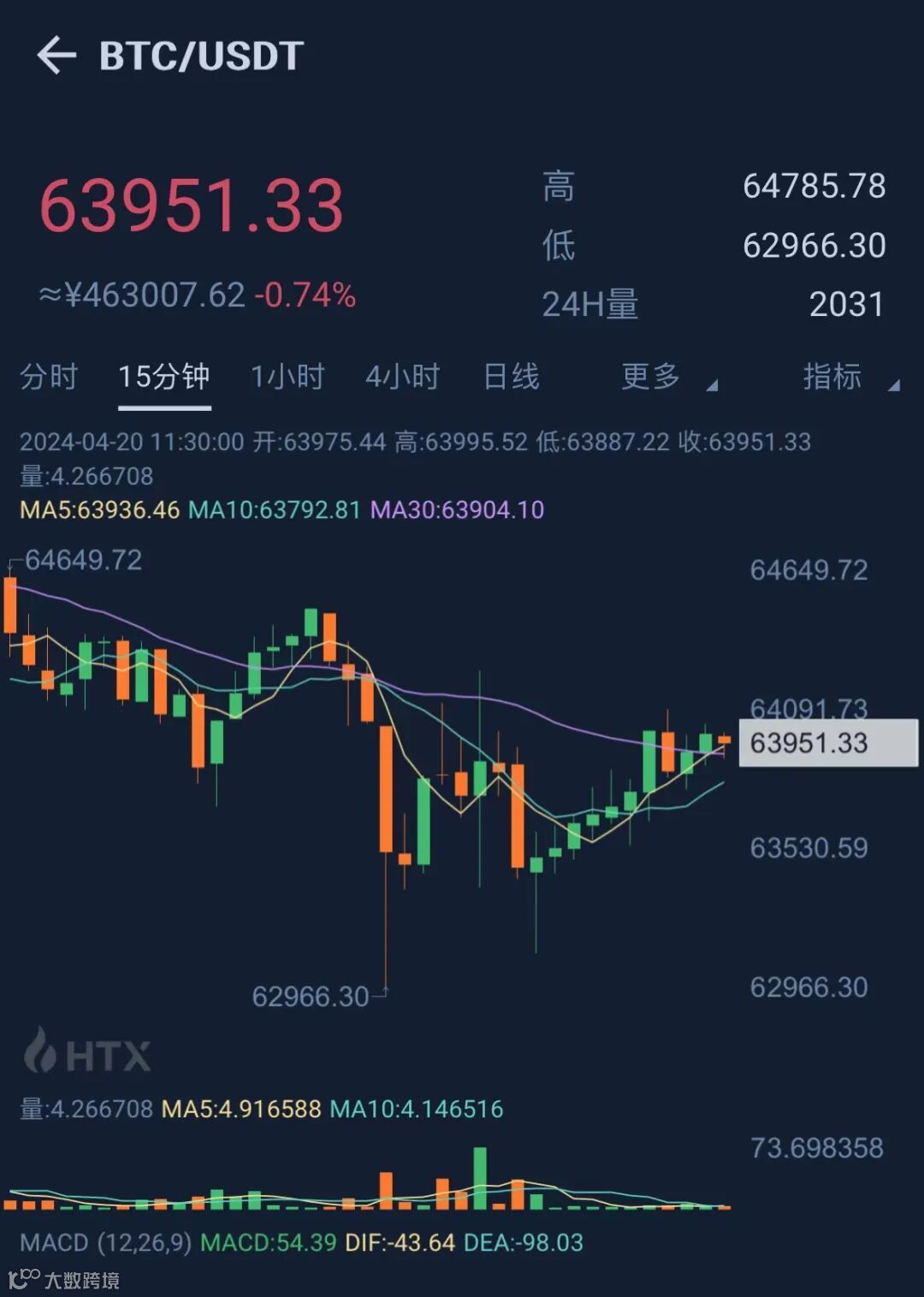 比特币减半完成后,比特币价格小幅下跌,现报63951美元/枚。